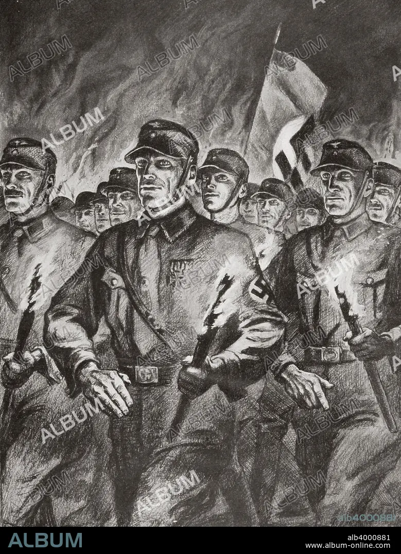 Caption: The historical torchlight procession of the SA in Berlin on 30th January, 1933. 30th January 1933 was the day Adolf Hitler became Chancellor of Germany. Founded in c1919, the Sturmabteilung (SA) was the paramilitary wing of the Nazi party. Its members were known as the 'Brownshirts' because of the colour of their uniforms. The SA played an important part in Hitler's rise to power in Germany but its significance was effectively ended when its leaders were killed in the 'Night of the Long Knives' in 1934, with the rival Schutzstaffel (SS) taking over its role.