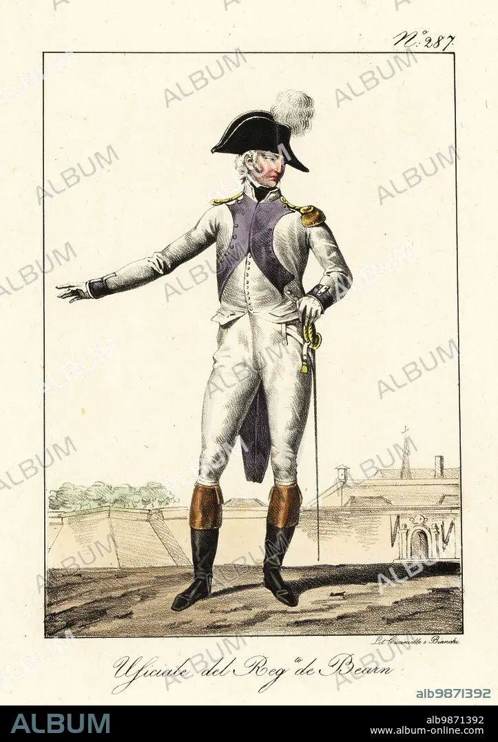 Officer in uniform of the Bearn Regiment, late 18th century. French Army regiment active from 1684-1762 that fought in the Seven Years' War. In bicorne with plume, white uniform with lilac cuffs and lapels, epaulettes, boots, sabre. Officier au Regiment de Bearn. Handcoloured lithograph by Lorenzo Bianchi and Domenico Cuciniello after Hippolyte Lecomte from Costumi civili e militari della monarchia francese dal 1200 al 1820, Naples, 1825. Italian edition of Lecomtes Civilian and military costumes of the French monarchy from 1200 to 1820.