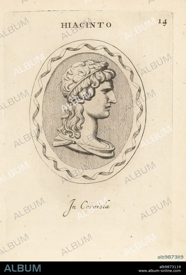 Caption: Bust of Hyacinthus, divine hero and a lover of Apollo from Greek mythology. Hyacinth. In carnelian. Hiacinto. In corniola. Copperplate engraving by Giovanni Battista Galestruzzi after Leonardo Agostini from Gemmae et Sculpturae Antiquae Depicti ab Leonardo Augustino Senesi, Abraham Blooteling, Amsterdam, 1685.
