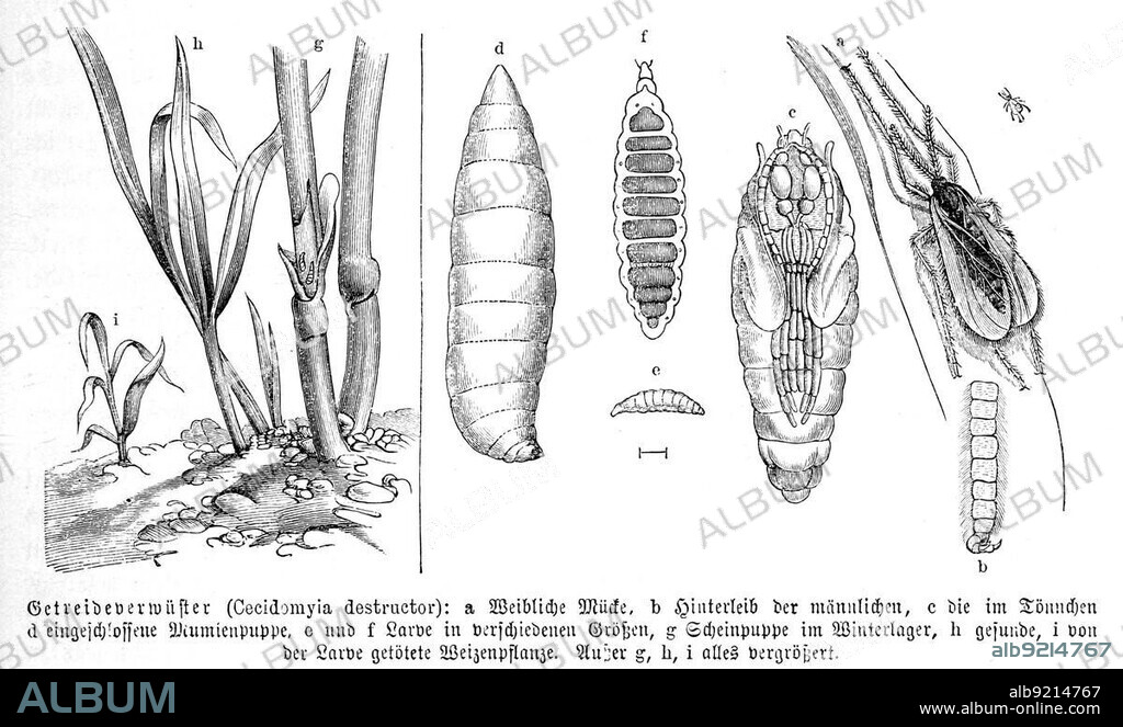Insects, Hessian fly (Mayetiola destructor), also called Hessian midge, rye gall midge (Cecidomyiidae) or cereal devastator, belongs to the gall midge family, and is one of the most important pests in cereal cultivation, Historical, digitally restored reproduction from a 19th century original.
