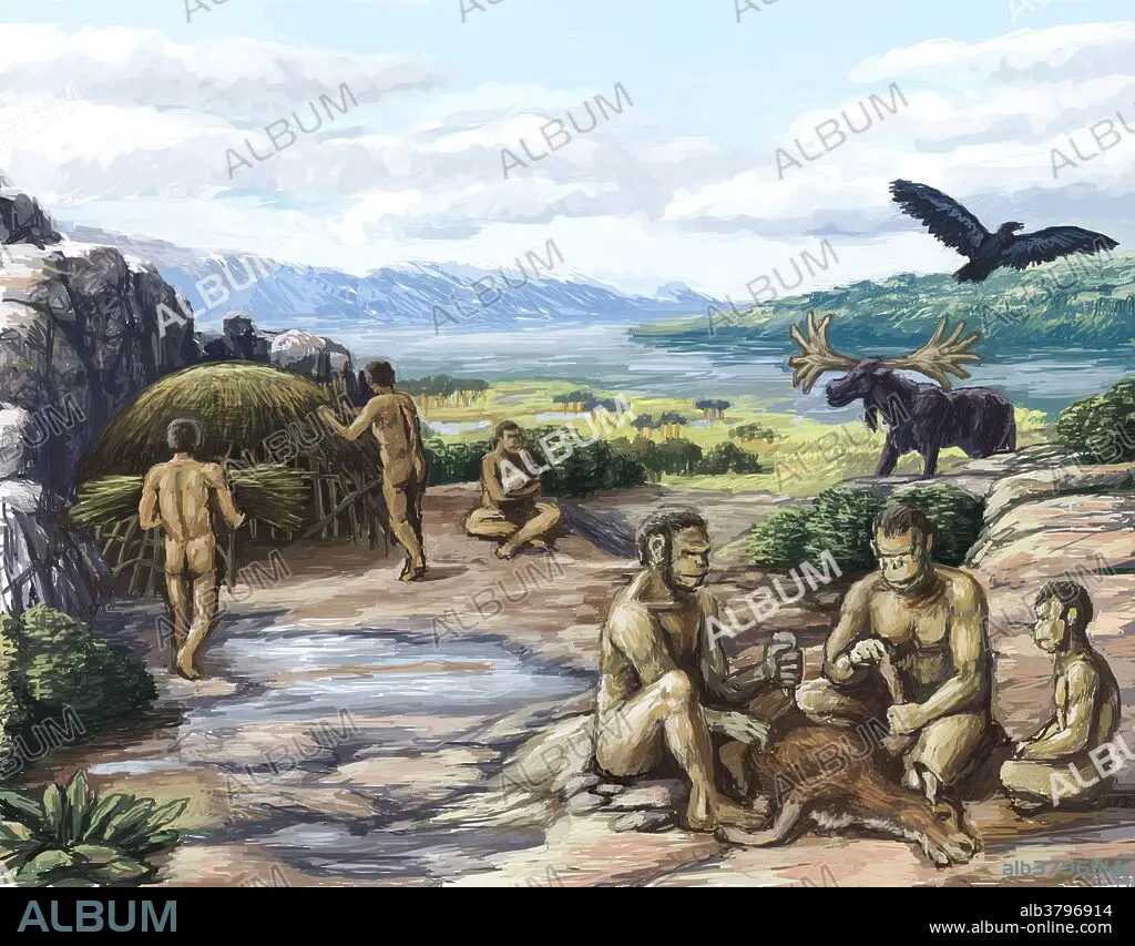 Caption: Illustration of an early hominid settlement in the Quaternary Period. Homo erectus appears in the start of this period and it is often referred to as the "Age of Humans".
