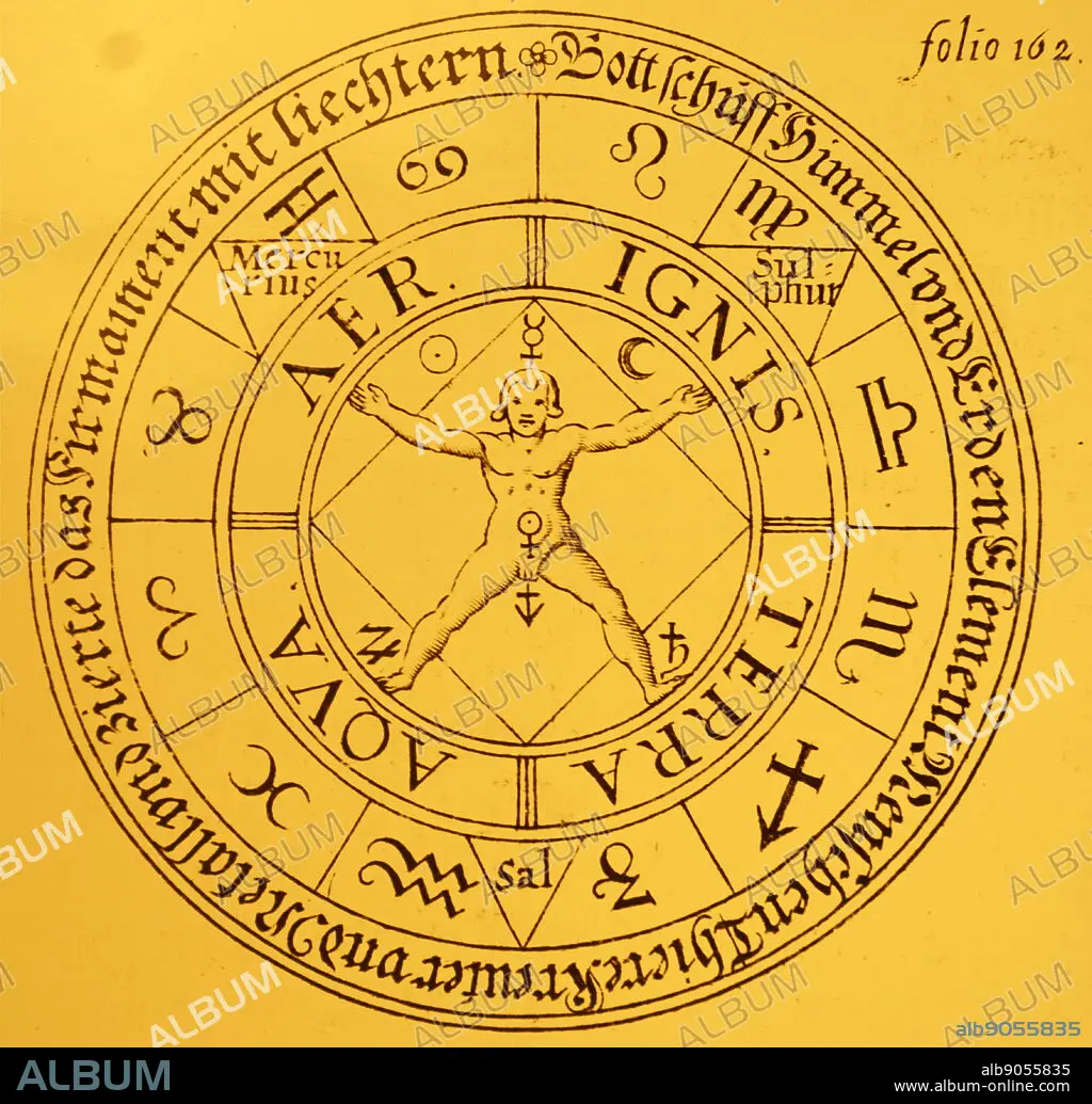 Caption: Engraving depicting a man as the microcosm within the universal macrocosm for the sulphur/Mercury theory for the production of the Philosopher's Stone. Dated 17th century