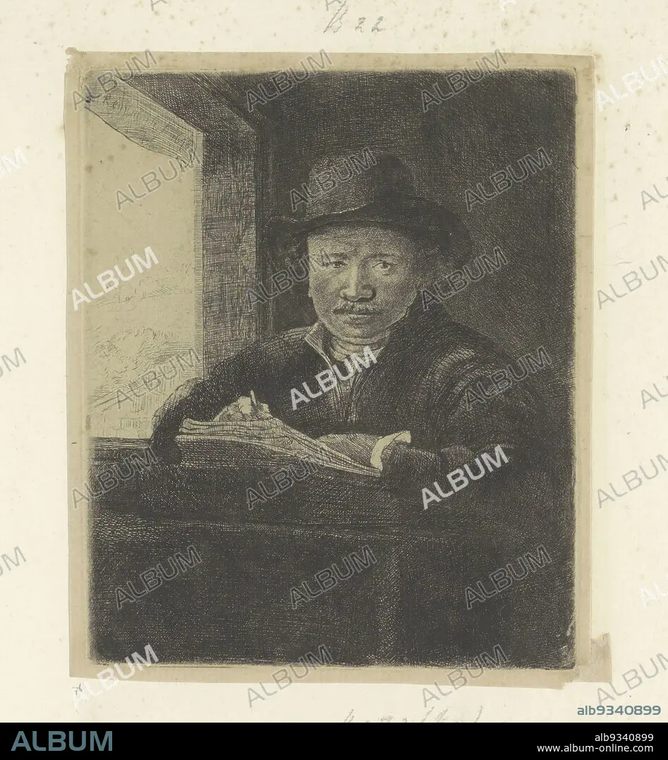 Caption: Self-portrait, drawing at a window, Recueil de quatre-vingt-cinq estampes originales (series title), The print is part of an album., print maker: Rembrandt van Rijn (mentioned on object), publisher: Henry Louis Basan, Paris, 1648 and/or 1807 - 1808, paper, etching, drypoint, height 160 mm × width 130 mm