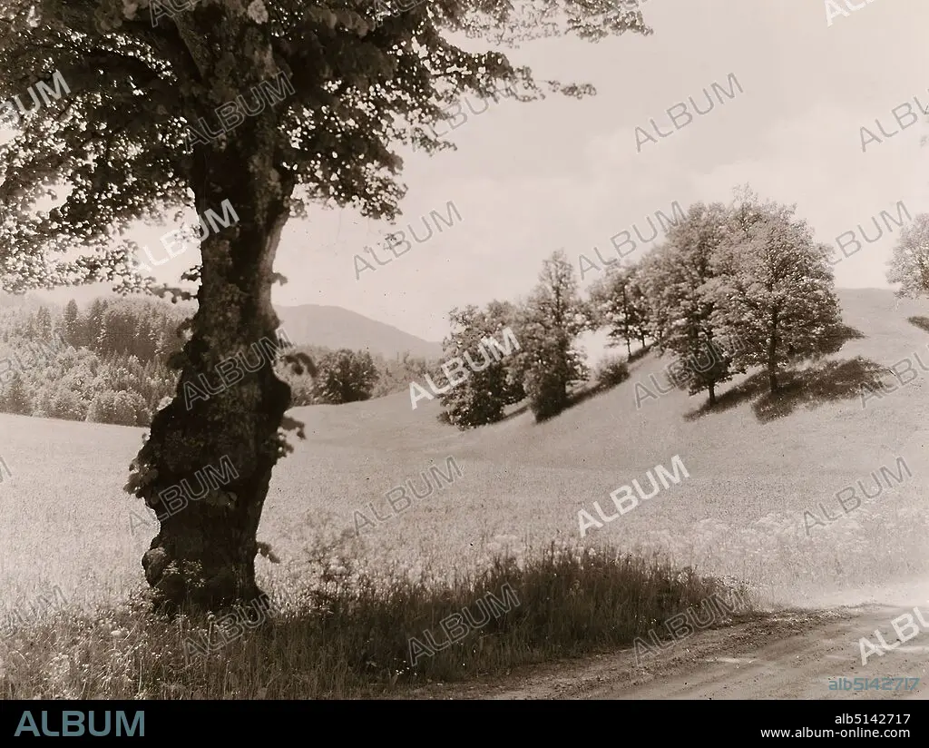 Caption: Heinrich Kühn, Summer landscape with trees, Staatliche Landesbildstelle Hamburg, collection on the history of photography, silver gelatin paper, cardboard, black and white positive process, image size: height: 29.50 cm; width: 39.10 cm, inscribed: verso cardboard: top left label in typewriter font: Heinrich Kuehn, stamp: verso cardboard: top left Stamp: Lehrsammlung der, Staatlichen Landesbildstelle Hamburg, Inventarisiert Nr. [supplemented in ink: B 195], artistic photography, landscape photography, trees, bushes, hilly landscape, summer, country road, way, path, meadow, pasture