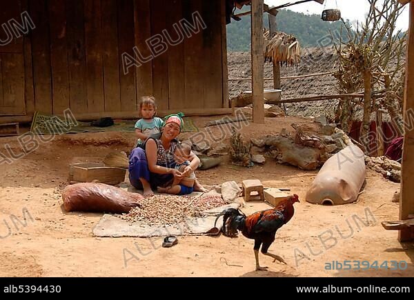 Everyday life in poverty for the Hmong minority, mother and child with the shell of an american bomb from the Vietnam war in the yard, village near Phonsavan, Xieng Khuang, Laos, Asia