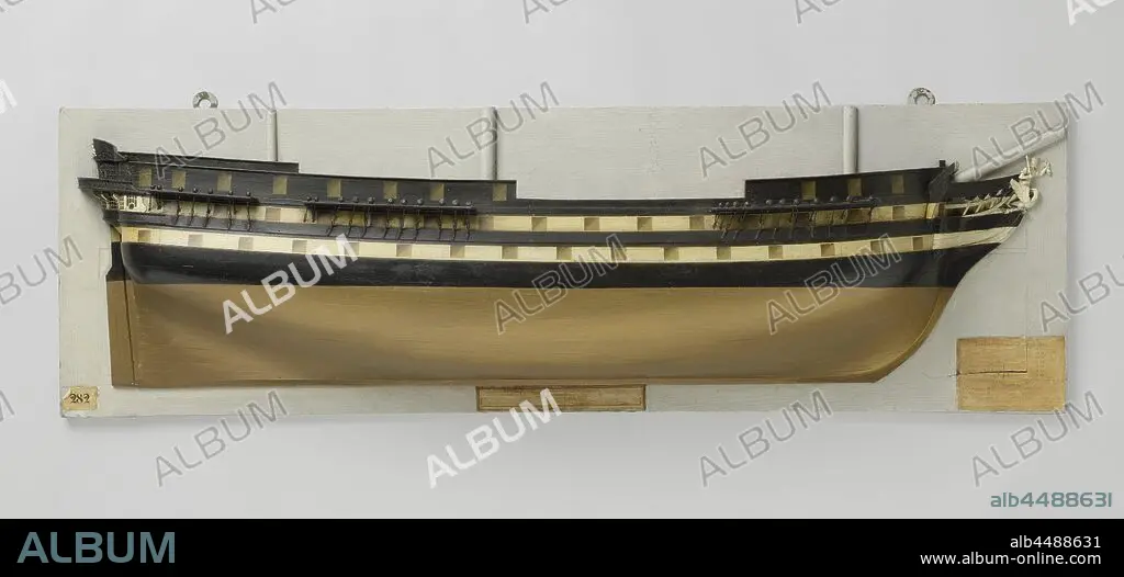 Caption: Half Model or a 74-Gun Ship of the Line, Fully planked and polychromed mold model (starboard) of a three-mast. Forty-six gun ports spread over three decks. The figurehead is a crowned man with a scepter in the right hand and a bundle of flames in the raised left hand, standing on a bird. A lion's head on the crane beam. Round stern with a two-storey fence, elaborately decorated, with a semicircular gallery at the rear. The western corridor on the top floor, which runs around the gallery, is supported by decorated knees. The bulwark above the fence is damaged. Below the gallery the hemp hole: straight rudder with square rudder king. The sheer runs slightly on both ends, two mountain wood and one deer wood. The underwater ship is fairly flat, but sharply cut away behind. Scale 1:50 (scale on model)., Jupiter (ship), Kortenaer (ship), anonymous, Netherlands, c. 1825 - c. 1833, wood (plant material), h 44 cm × w 135.6 cm × d 17.1 cm