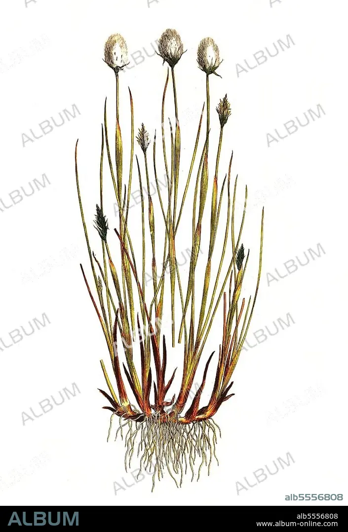 Caption: Scheiden-Wollgras, auch Moor-Wollgras, Scheidiges Wollgras (Eriophorum vaginatum) oder Schneiden-Wollgras, digital restaurierte Reproduktion einer Originalvorlage aus dem 19. Jahrhundert, genaues Originaldatum nicht bekannt