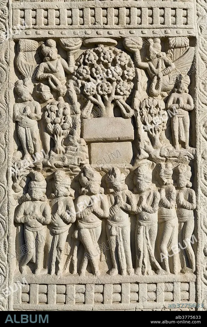 Caption: Relief depicting the life of Buddha, stupas of Sanchi, UNESCO World Heritage site, built by King Ashoka, the Mauryan dynasty, Sanchi, Vidisha in Madhya Pradesh, North India, India, Asia