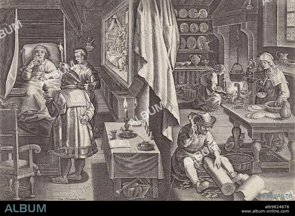 Caption: Prostitution; brothel; medicines for the treatment of syphilis; medicine; 1589; Holland; Historical; digitally restored reproduction from a 19th century original