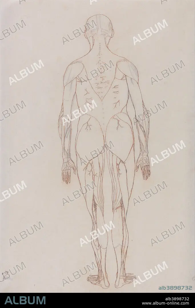 Caption: A Comparative Anatomical Exposition of the Structure of the Human Body with That of a Tiger and a Common Fowl: Human Figure, Posterior View (Outline Drawing for Key Figure to Table XII). Date/Period: 1795 to 1806. Drawing. Black and red chalk, and graphite; verso: black chalk and graphite on cream, thin, smooth, wove paper. Height: 489 mm (19.25 in); Width: 330 mm (12.99 in).