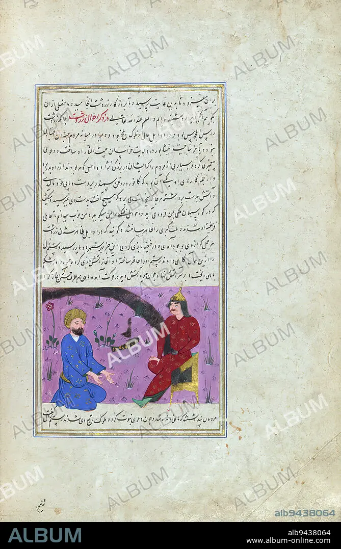 Caption: Wonders of creation, Zardusht (Zoroaster) visits Rustam, A Persian version of the famous 'Wonders of creation' (Ajib al-makhlqt) by Zakariy al-Qazwn (d. 682 AH / 1283 CE). Composed by Shams al-Dn Muammad al-s (fl. 6th century AH /12th CE), this manuscript, which may have been copied by an Iranian scribe, was illustrated with 181 miniatures (including a double-page map of the world) by several artists probably in Turkey in the 10th century AH / 16th CE.