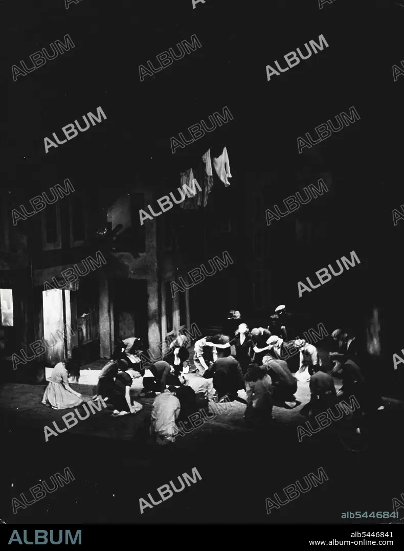 Caption: Miracle In The Gorbals - A New Helpmann Ballet -- The scene at the stranger resurrects the Suicide. Miracle in the Gorbals, a new ballet by Robert Helpmann, with music by Arthur Bliss and decor by Edward Burra, was presented by the Sadler's Wells Company at the Prince's Theatre on Thursday 26th October. Miracle In The Gorbals has a scenario - a modern story set in the Gorbals district of Glasgow - by Captain Michael Benthall, R.A., who devised the production of Hamlet in which Helpmann acted the Prince last spring. The music by Arthur Bliss was specially composed for the ballet. January 1, 1944. (Photo by British Official Photograph).