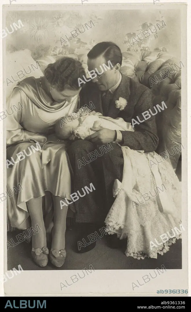 Portrait of Juliana, Queen of the Netherlands, Bernhard van Lippe-Biesterfeld and Beatrix, Queen of the Netherlands, Portrait of Juliana, Bernhard and Beatrix. Created on the occasion of the baptism of Beatrix in the Grote Kerk in The Hague on May 12, 1938., anonymous, publisher: Nijgh & Van Ditmar (mentioned on object), Netherlands, publisher: Rotterdam, 1938, photographic support, height 140 mm × width 89 mm