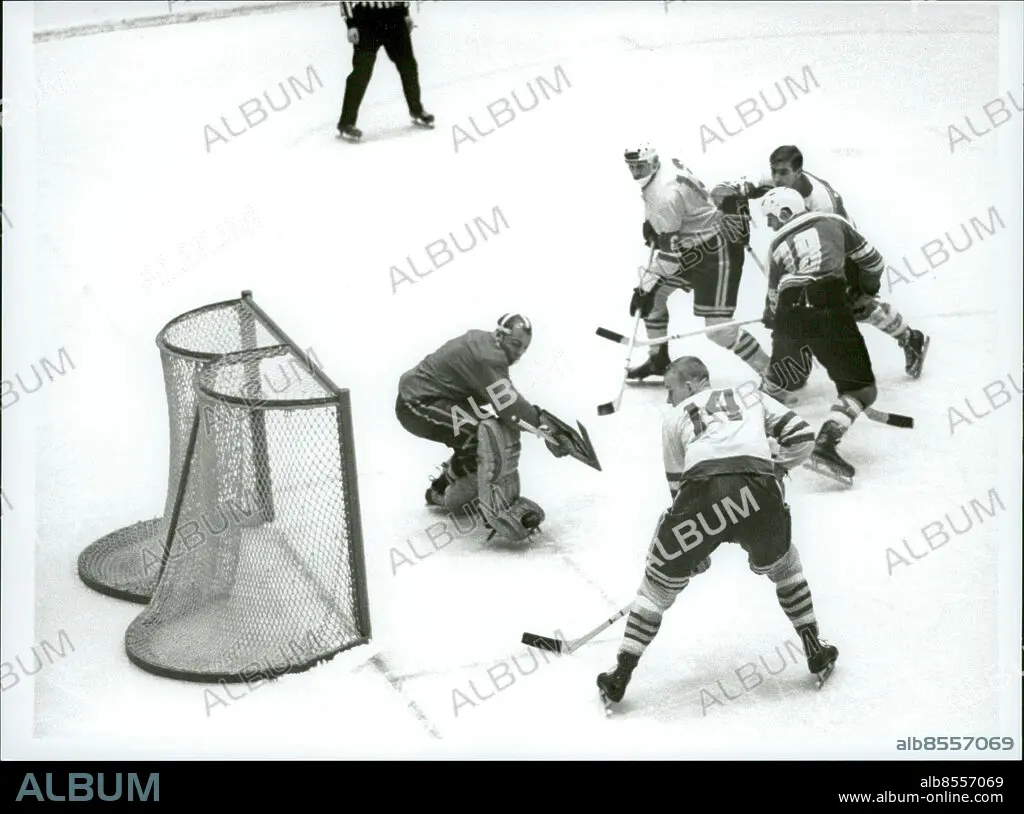 Innsbruck 1964-02-08. Ishockeyspelaren Sven Tumba spelar till Uno "Garvis" Öhrlund under ishockeymatchen Sverige-Tjeckoslovakien under vinter-OS i Innsbruck 1964. Foto: Pica / TT / kod 20360