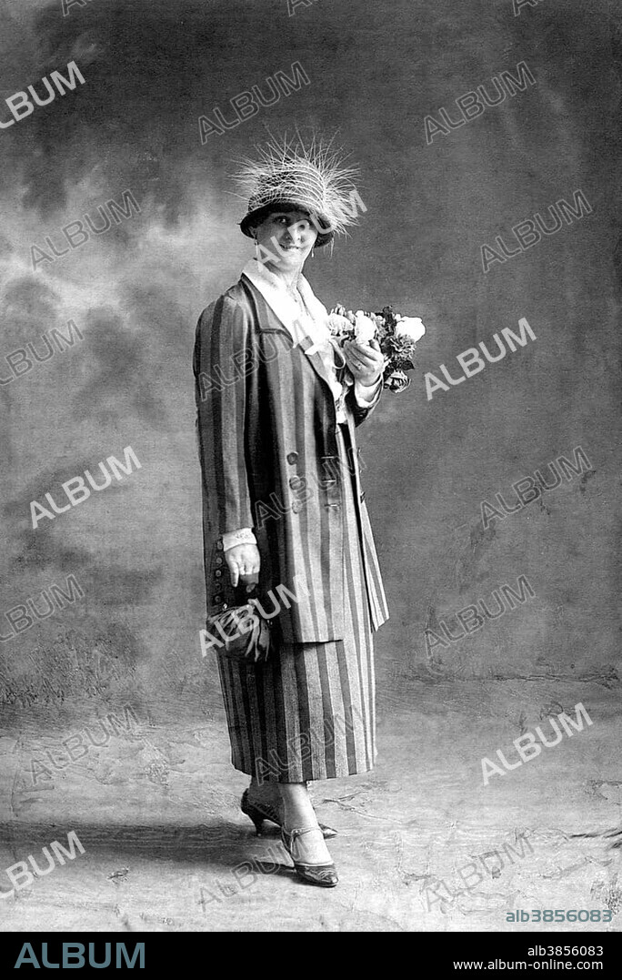 Caption: Fashion, hat fashion, woman in striped costume, handbag and feather hat, 1920s, Germany, Europe