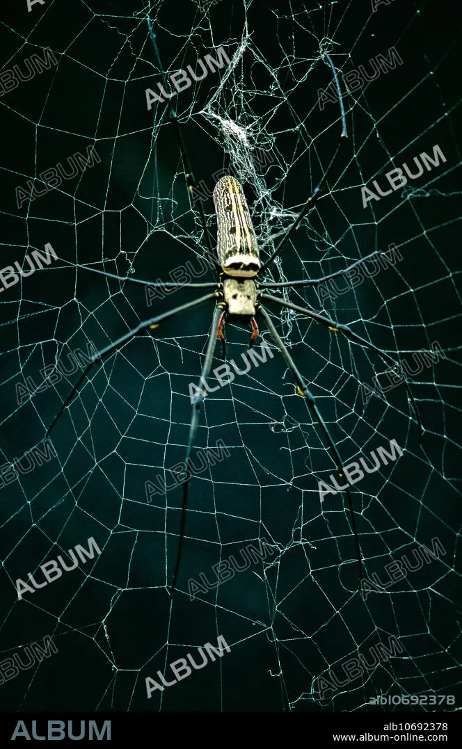 Caption: A Golden Orb Web spider (Nephila sp) in dry deciduous forest, Srepok Wilderness Area, Cambodia.