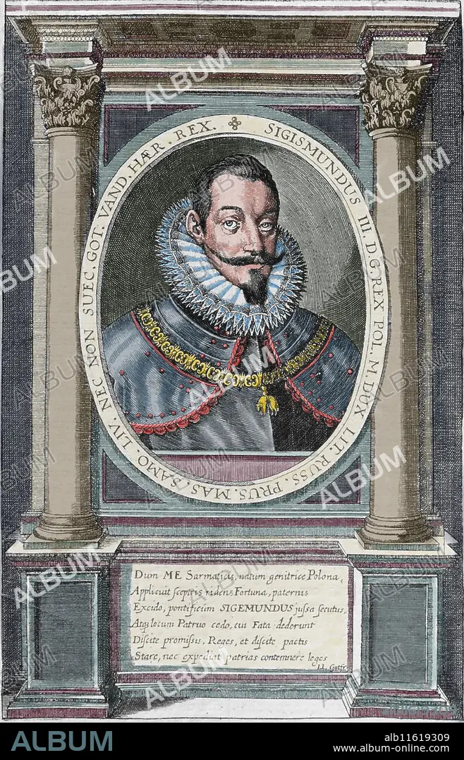 Caption: Sigismund III Vasa (1566-1632). King of Poland and Grand Duke of Lithuania, monarch of the united Polish-Lithuanian Commonwealth and king of Sweden. Engraving by Friedrich van Hulsen (1580-1665), 1632. Universal History, 1885. Later colouration.