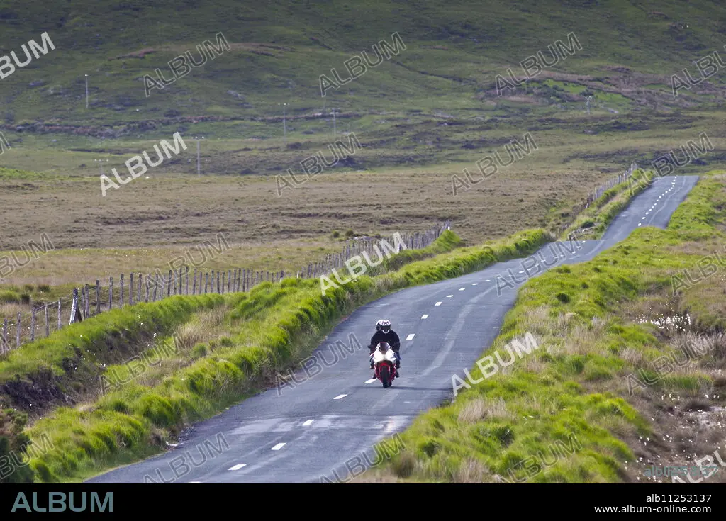 Motorcyclist on Kylemore Pass in Connemara National Park, County Galway, Ireland