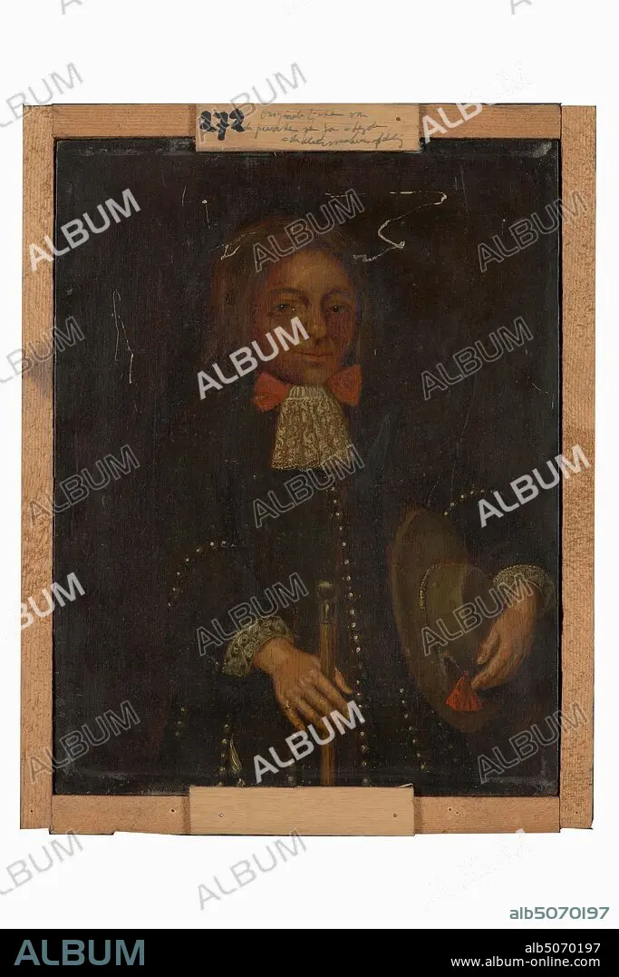 Caption: painting, Johann Philippus Neeb, 1845, Signature front, bottom left: J.P. Neeb 1845, panel, oil paint, painted, Carrier: 27.4 × 24 × 1.4cm (274 × 240 × 14mm), With frame: 41.2 × 38.5 × 5cm (412 × 385 × 50mm), Portrait of an unknown man. He is depicted half-length, straight in front and looking at the viewer. He is wearing a black skirt with a white shirt and a white collar. On the left behind him, a part of the back of the chair on which he is sitting can be seen. There is also a green curtain on the left. It is depicted against a dark background. Signed bottom left. The painting is in a black-painted wooden frame with a gilded inner edge, man's portrait