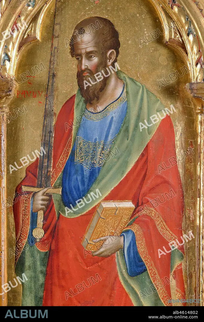 Caption: San Severino Marche, Pinacoteca Comunale: Paolo Veneziano, Polyptych (1358) with Saints. Detail of St. Paul holding a sword in one hand and the book in the other one.