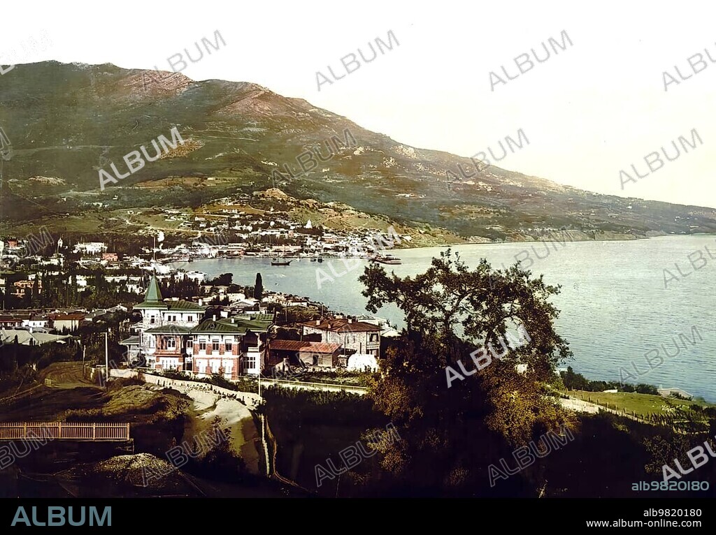 Caption: Coastal Panorama; Roads; Street; Yalta; Crimea; Russia; Ukraine; c. 1890; Historic; digitally enhanced reproduction of a photochromic print of the period; Europe