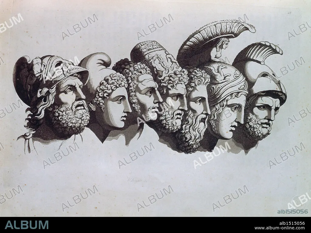 Caption: Greek civilization. The heroes of the Trojan War. From left: Agamemnon, Nestor, Ulysses, Diomedes, Pericles, Menelaus. From Giulio Ferrario, Ancient and Modern Custom of all Peoples, Milan 1827.