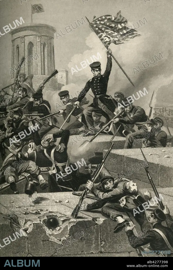 Caption: 'Storming of Chapultepec', (1878). The Battle of Chapultepec in September 1847 was fought between the United States Marine Corps and US Army against Mexican forces holding Chapultepec Castle in Mexico City. The Americans took the castle in fierce fighting. From "Our Country: a Household History for All Readers, from the Discovery of America to the Present Time", Volume 3, by Benson J. Lossing. [Johnson & Miles, New York, 1878]