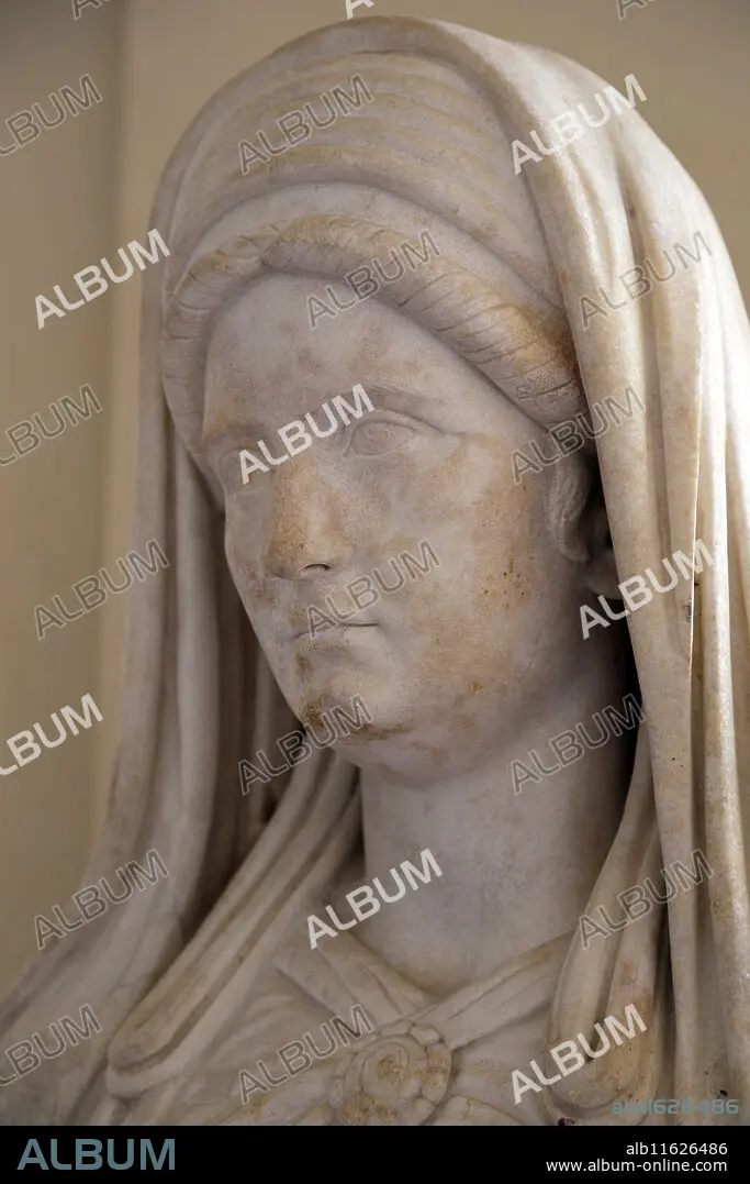 The Vestalis Maxima. Portrayed with a mural crown, was the most eminent of the priestesses devoted to the cult of Vesta, the Most eminent of the Hearth. Roman. Roman Forum. House of the Vestal Virgins. Late Hadrianic. Antonine period.