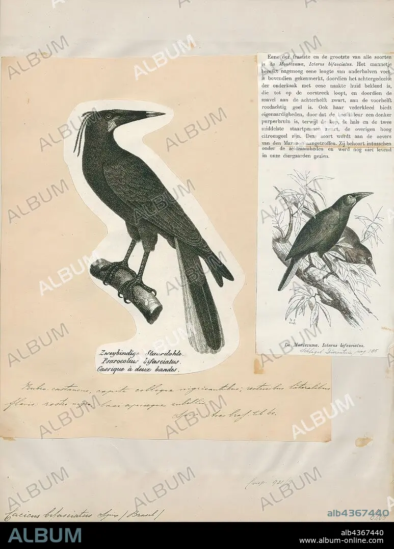 Cacicus bifasciatus, Print, Cacique (bird), The caciques are passerine birds in the New World blackbird family which are resident breeders in tropical South America north to Mexico. All of the group are in currently placed in the genus Cacicus, except the aberrant yellow-billed cacique (Amblycercus holosericeus), and the Mexican cacique (Cassiculus melanicterus) which constitute respective monotypic genera. Judging from mitochondrial DNA cytochrome b and NADH dehydrogenase subunit 2 sequence (Price & Lanyon 2002), the aberrant oropendolas band-tailed oropendola (Ocyalus latirostris) and casqued oropendola, Psarocolius oseryi (Ocyalus oseryi?) seem to be closer to the caciques., 1700-1880