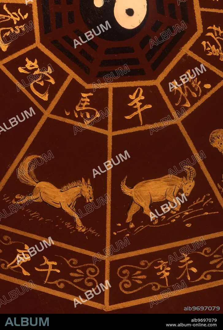 Caption: The Chinese symbolic animal Horse and sheep, Libra and Scorpio. painted lacquerwork from Beijing