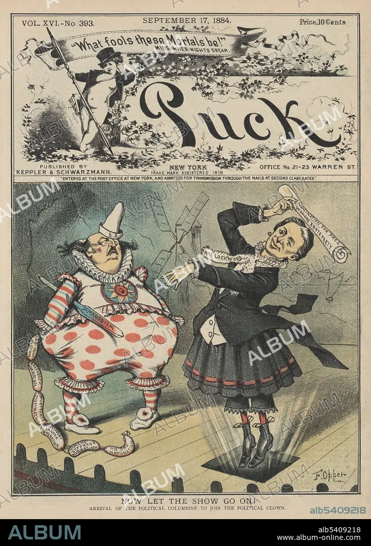 Caption: Now let the show go on! Illustration shows Mrs. Lockwood, holding papers that state, Nomination for Pres. Womens' Rights Party, bursting through an opening in the floor of a stage to appear next to a clown labeled B.B. who is holding a paddle labeled, Demagogism, and a string of sausages labeled, His Own Nomination, Womens' Suffrage Nomination, Tewksbury Pauper Nomination, Convict Party Nomination, Greenback Nomination, Last Nomination. Belva Ann Bennett Lockwood (October 24, 1830 - May 19, 1917) was an American attorney, politician, educator, and author. She ran for president in 1884 and 1888 on the ticket of the National Equal Rights Party and was the first woman to appear on official ballots. Frederick Burr Opper, Puck Magazine September 17, 1884.
