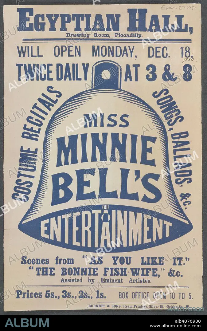 Caption: A poster for entertainment by Minnie Bell at the Egyptian Hall Drawing Room, 1882 . [London] : Burnett & Sons, steam printers, Silver St., Golden Sq., W., 1882. Source: Evan.2734. Language: English.