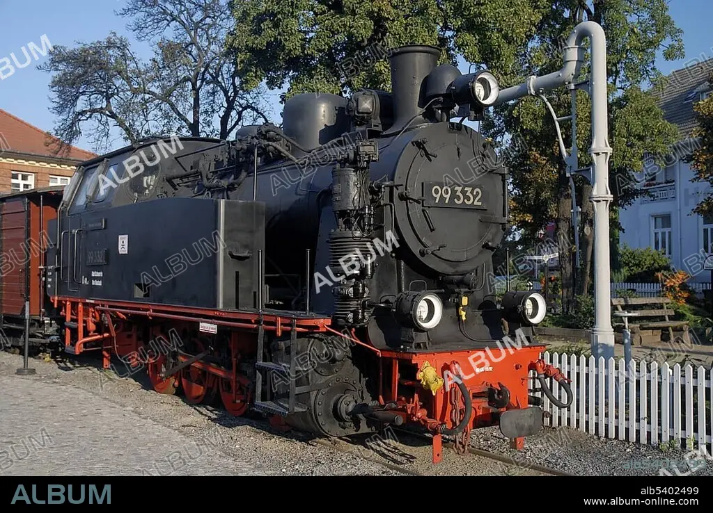 Caption: Historic steamer of narrow-gauge railway at the Molli museum at railway station Kuehlungsborn West, Kuehlungsborn, Western Pomerania, Germany, Europe