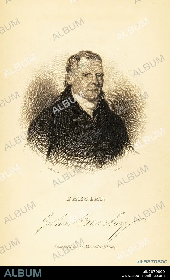Caption: Portrait of John Barclay, 1758-1826, Scottish comparative anatomist and director of the Highland Society of Scotland. Steel engraving by Lizars after an illustration by John Syme from George Robert Waterhouse's Marsupialia or Pouched Animals, Volume XI of the Naturalists Library, W. H. Lizars, Edinburgh, 1841. Waterhouse (1810-1888) was curator at the Zoological Society of Londons museum.