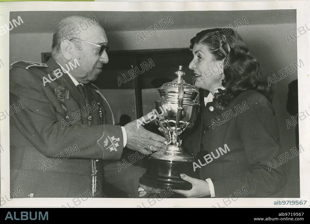 Caption: Madrid, 05/01/1955. The national sports delegate, General Moscardó, presents the Duchess of Valencia, Luisa Narváez, with the equestrian cup of the Generalísimo Grand Prix, won by "Chipirón", a horse he owns.