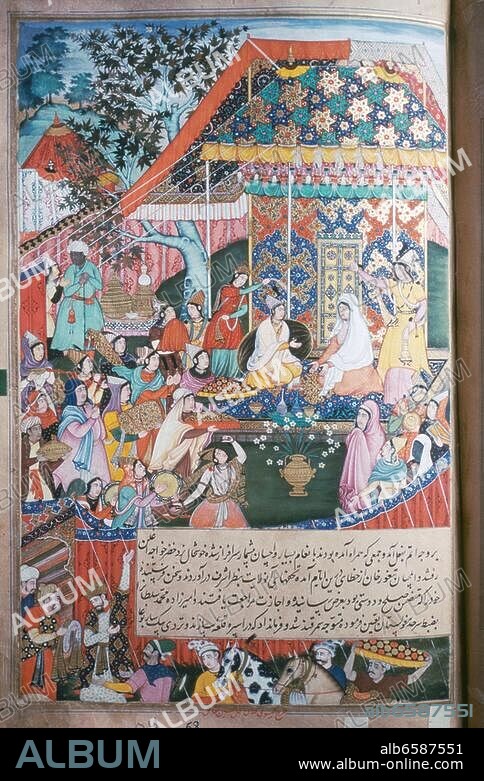 Timur (Tamerlane, "Timur the Lame"). Turkic ruler; Asian conqueror; founder of the Timurid dynasty; 8.4.1336 - 19.1.1405. Scene at court: Harem tent. Illustration from the Timur-nama (History of Timur). Indian miniature, Mughal school, 1580. Gouache on paper. Patna, Khuda Bakhsh Oriental Library.