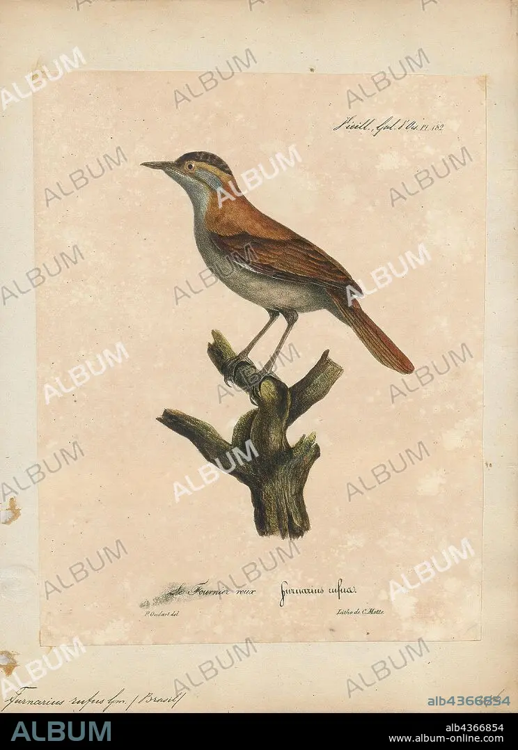 Caption: Furnarius rufus, Print, The rufous hornero (Furnarius rufus) is a medium-sized ovenbird in the family Furnariidae. It occurs in eastern South America, and is the national bird in Argentina. Also known as the red ovenbird, it is common in savannas, second-growth scrub, pastures and agricultural land and is synanthropic. Its range includes southeastern and southern Brazil, Bolivia, Paraguay, Uruguay and northern and central Argentina, extending as far south as northern Patagonia. The species is most closely related to the crested hornero of Paraguay and Argentina. There are four accepted subspecies., 1825-1834