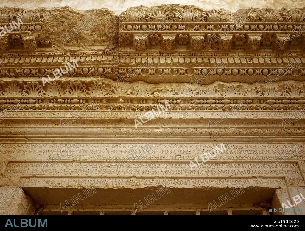 Caption: Syria. Palmyra city. Inscription in cursive Palmyrene (dialect of Aramaic, Semitic alphabet), used between 100 BC-300 BC. Sculpted in the stone. These remains were destroyed by ISIS in 2015, during the Syrian Civil War.