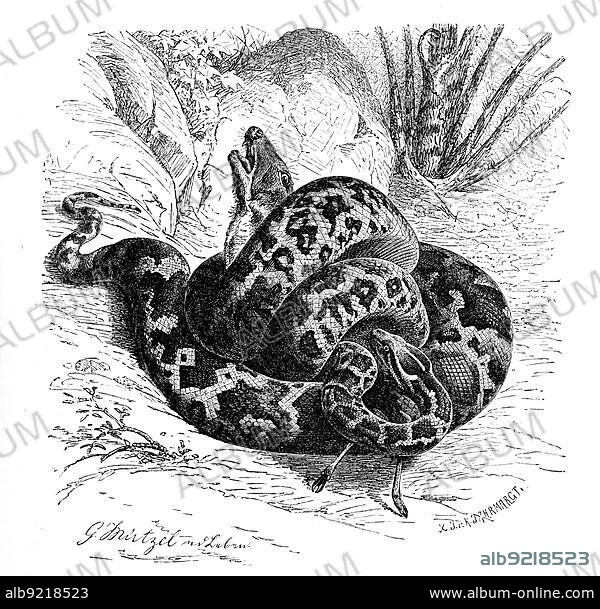 Reptiles, Bright indian python (Python molurus) is a species of snake in the python family, Historical, digitally restored reproduction from a 19th century original.