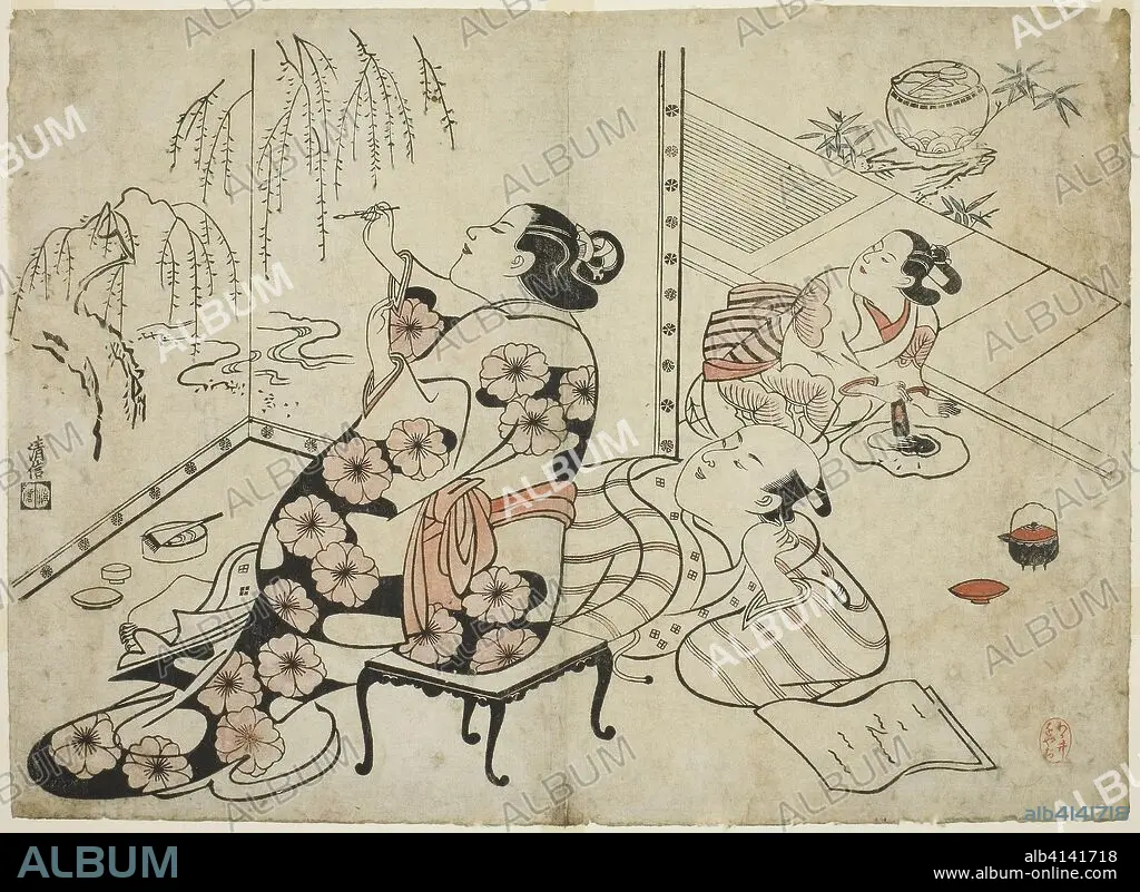 Caption: Courtesan Painting a Screen, from a series of 12 erotic prints. Torii Kiyonobu I; Japanese, 1664-1729. Date: 1706-1716. Dimensions: 10 5/8 x 14 5/8 in. Hand-colored woodblock print; oban, sumizuri-e. Origin: Japan.