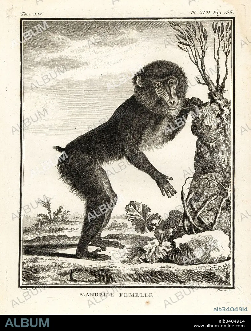 Caption: Mandrill, Mandrillus sphinx. Female. Copperplate engraving by Baron after an illustration by Jacques de Seve from Georges-Louis Leclerc, Comte de Buffon's Histoire Naturelle, Imprimerie Royale, Paris, 1766.