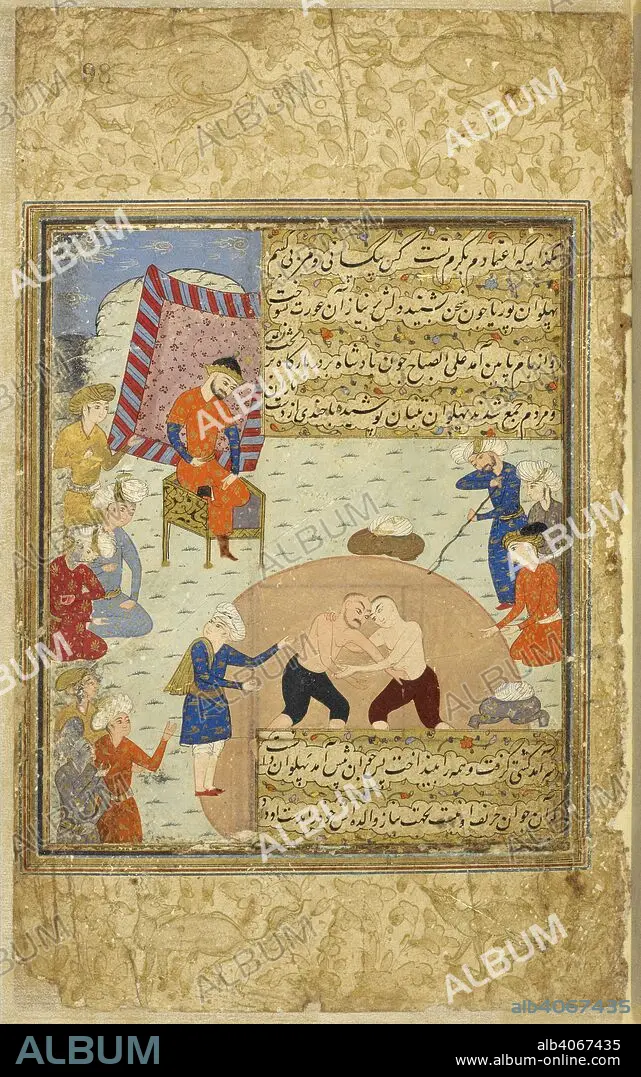 Caption: Pahlawan Mahmud wrestling. Majalis al-'Ushshaq of Sultan Husayn Mirza. Shiraz, Iran, 1590-1600. Pahlawan Mahmud wrestling before an enthroned prince. A miniature painting from a sixteenth century manuscript of the Majalis al-'Ushshaq ('The Assemblies of the Lovers'). Image taken from Majalis al-'Ushshaq of Sultan Husayn Mirza. Originally published/produced in Shiraz, Iran, 1590-1600. Source: I.O. ISLAMIC 1138, f.98. Language: Persian.