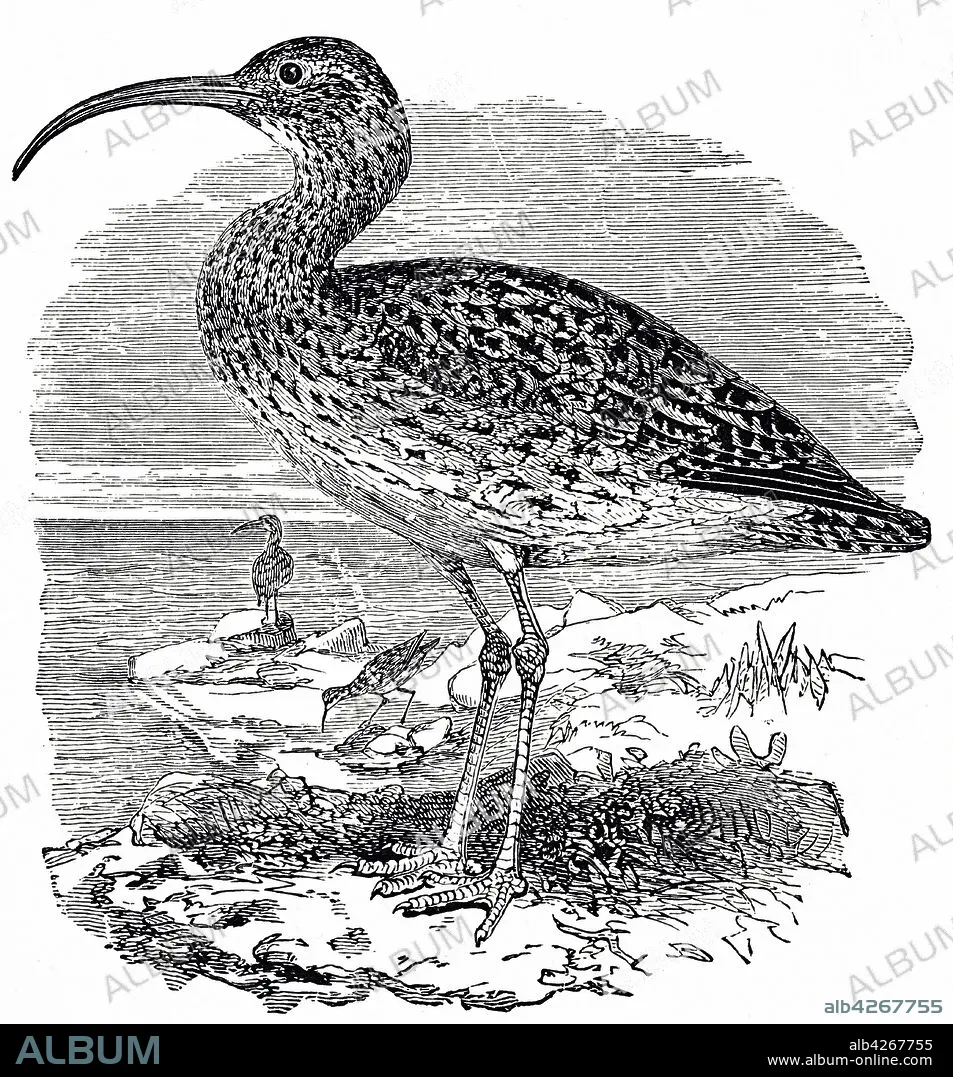 Caption: Engraving depicting a Curlew, a group of eight species of birds, characterised by long, slender, down curved bills and mottled brown plumage. Dated 19th century