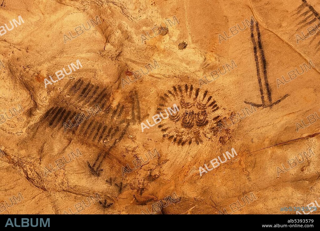 Caption: Symbolic rock painting of the Adnyamathanha People, Aborigines, Yourambulla Caves at Quorn, South Australia, Australia, Oceania