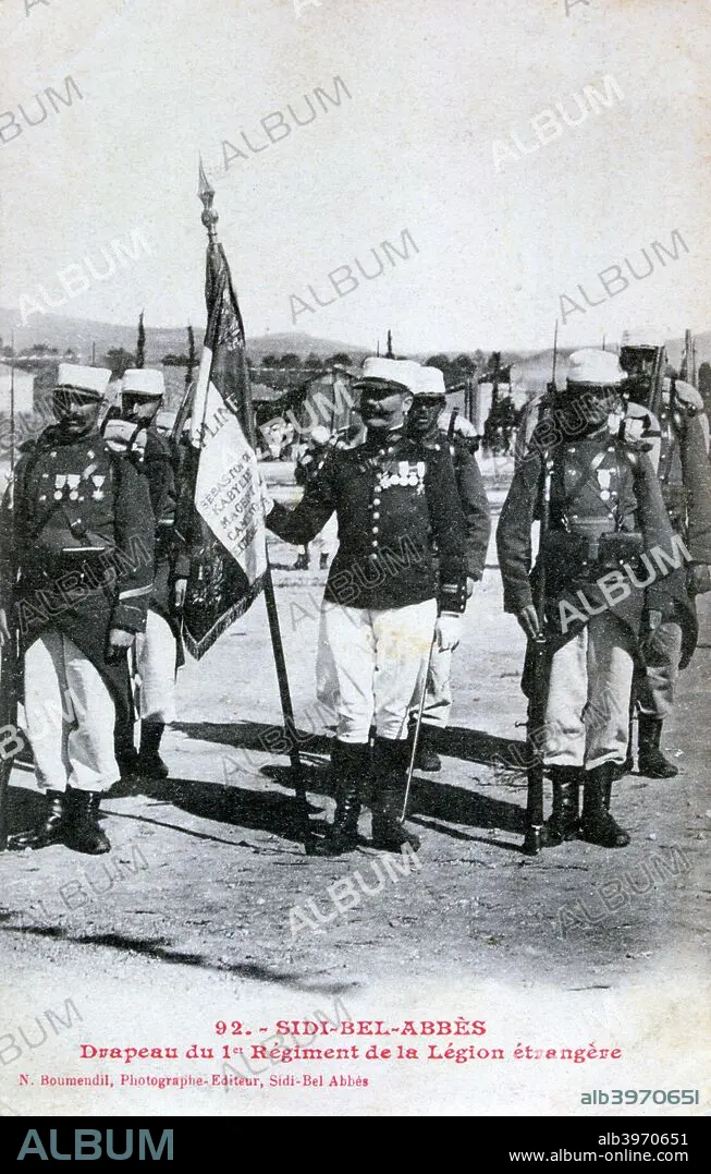 Flag of the 1st Regiment of the French Foreign Legion, Sidi Bel Abbes, Algeria, 1933. The flag is inscribed with the names of battles in which the Legion fought, including Sevastopol (1855), Kabylia (1857), Magenta (1859) and Camaron (1863). Sidi Bel Abbes was the Legion's headquarters from 1931-1961. French postcard.