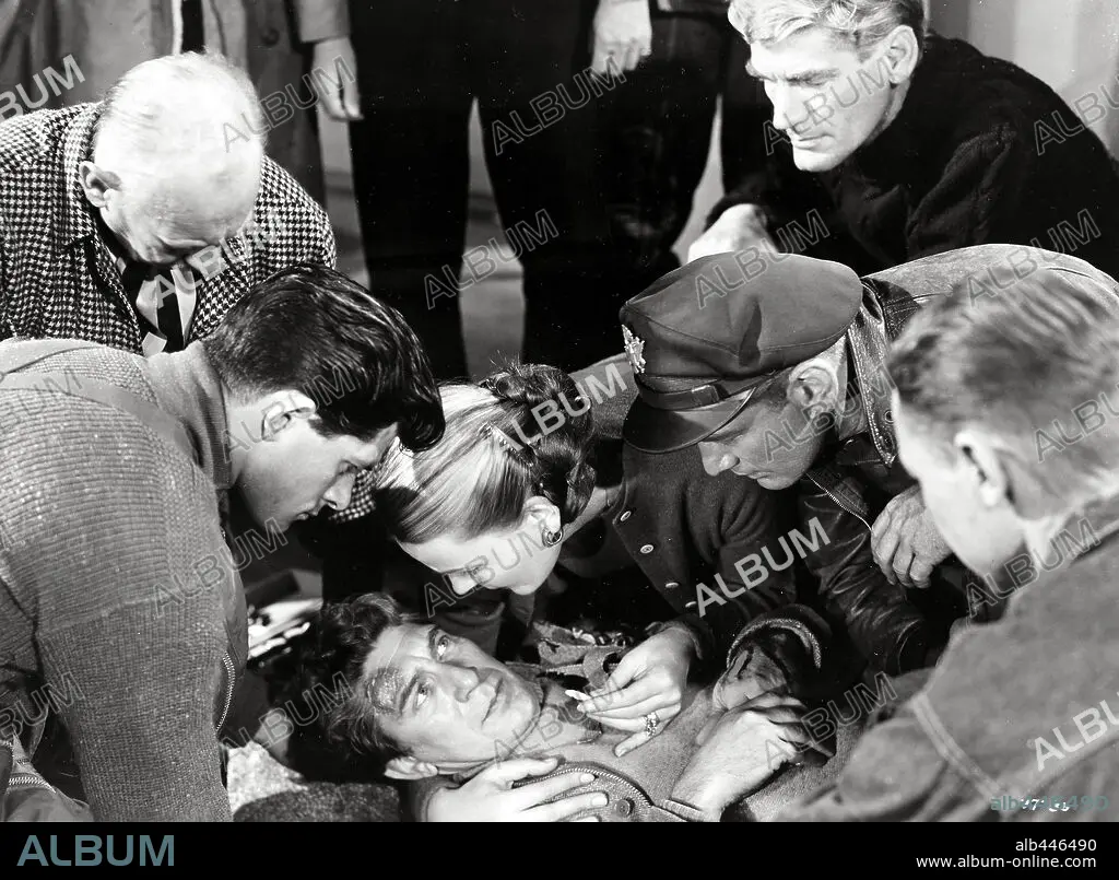 DEWEY MARTIN, EDUARD FRANZ, KENNETH TOBEY and MARGARET SHERIDAN in THE THING FROM ANOTHER WORLD, 1951, directed by HOWARD HAWKS. Copyright RKO.