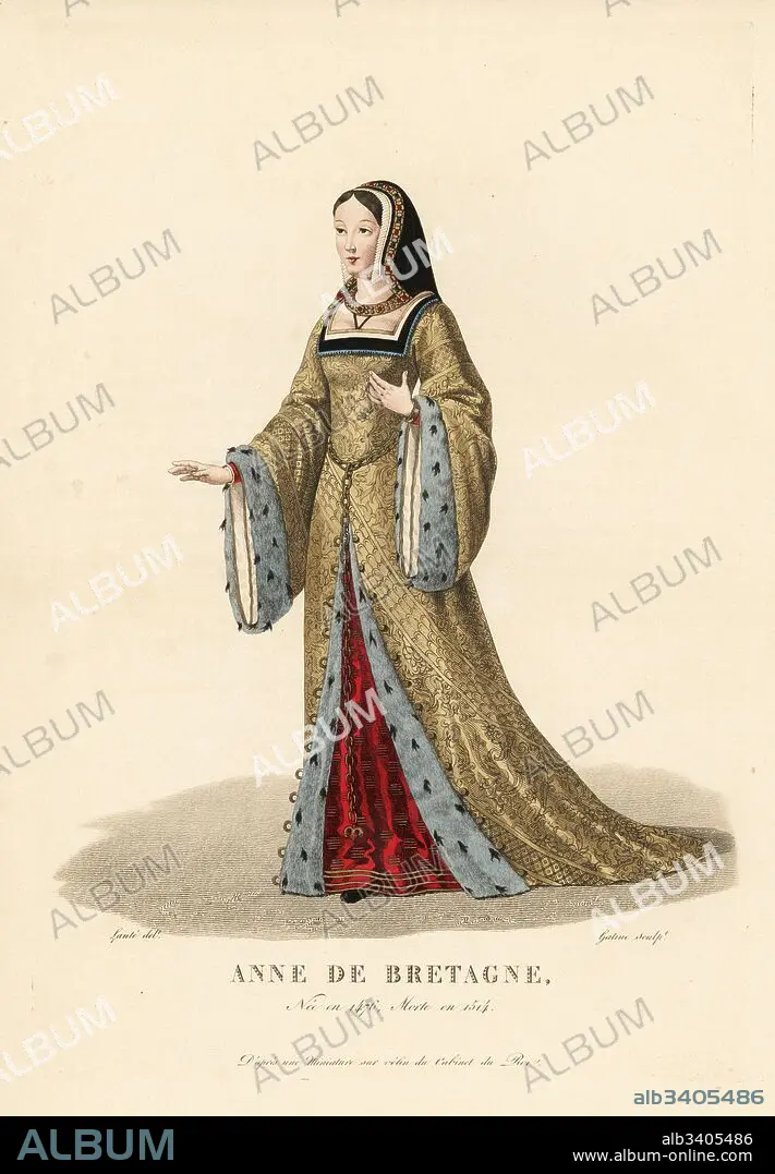 Caption: Anne of Britanny, wife to King Charles VIII and King Louis XII of France, 1476-1514. She wears a cape bretonne headdress over a white cap, brocade robe trimmed with ermine, and gold chain belt. After a miniature on vellum in the Royal Collection. Handcoloured copperplate engraving by Georges Jacques Gatine after an illustration by Louis Marie Lante from Galerie Francaise de Femmes Celebres, Paris, 1827.