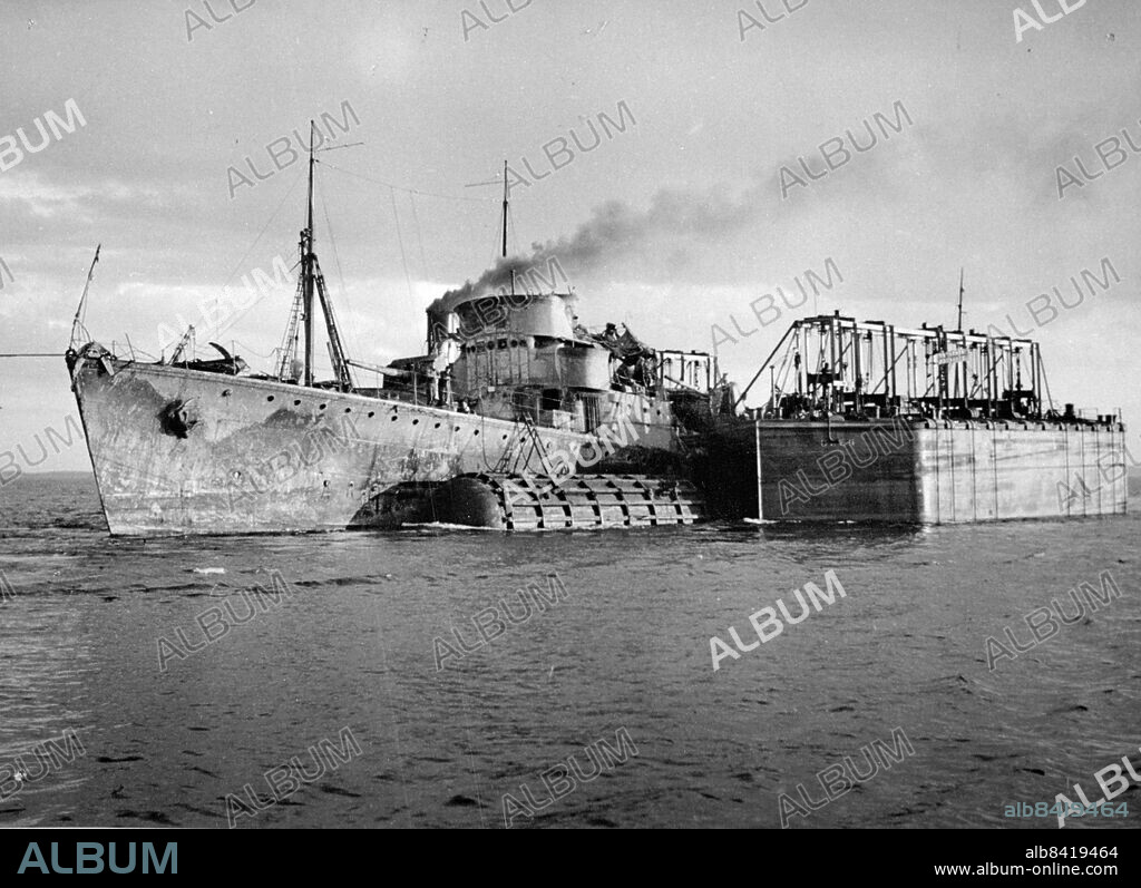 Stockholm 1941-09-20. Jagaren Klas Horn har bogserats från Hårsfjärden till Finnboda varv. 33 man omkom på Hårsfjärden då de tre jagarna Klas Uggla, Klas Horn och Göteborg brann efter en explosion ombord. Foto: Pica Pressfoto / TT / kod 20360