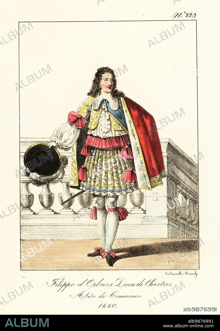 Caption: Philippe I, Duke of Orléans, in ceremonial robes, 1660. In scarlet cape, embroidered waistcoat and skirts, hose and garters, court sword. Younger brother of King Louis XIV of France. Philippe d'Orleans, Duc de Chartres. Costume de Ceremonie.