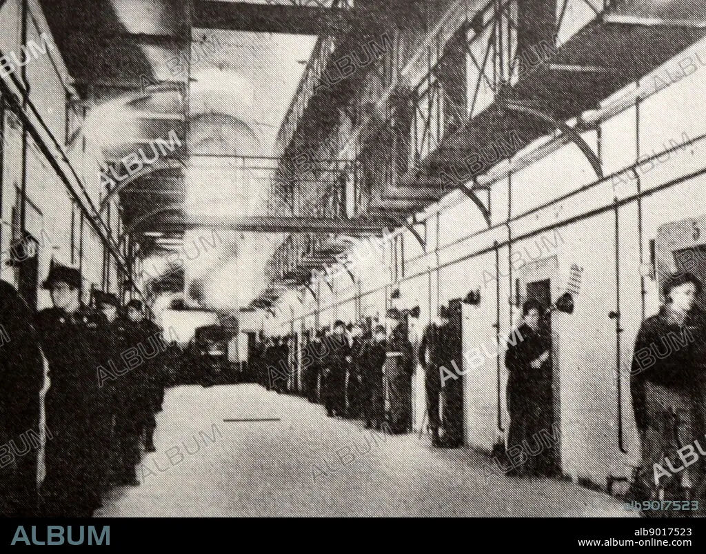 Caption: Black and white photograph of World War II (1939-1945) showing images related to the Nuremberg Trials, the largest prosecution in history, and which began in November 1945; a corridor of prison cells with a guard placed at the door of each cell.